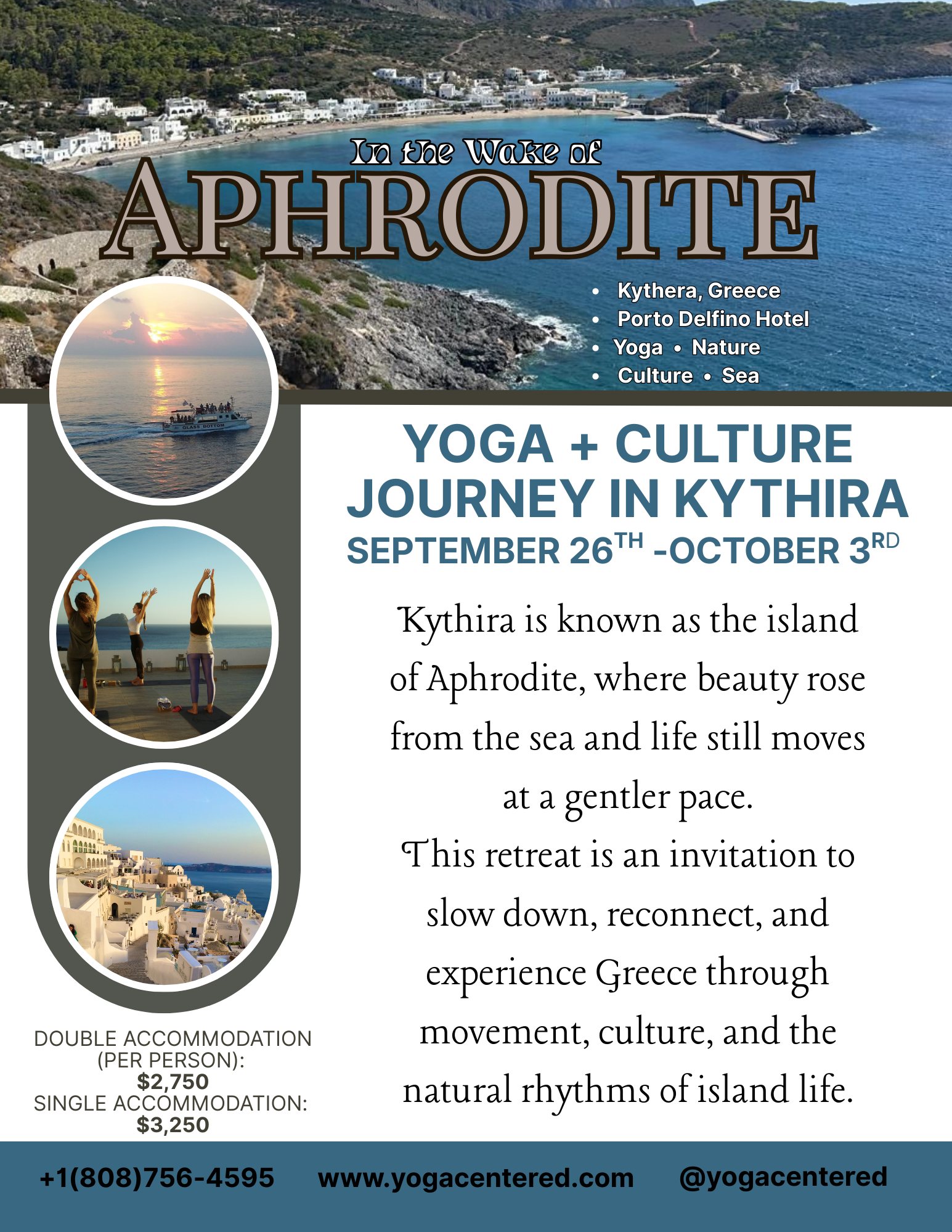 From September 26 – October 3, 2026, join Molly of Yoga Centered on the soulful, unspoiled island of Kythira, Greece— the mythical birthplace of Aphrodite, where life slows down and beauty rises from the sea. This week-long yoga and cultural journey is an opportunity to step out of routine and into presence, blending intentional daily yoga, breathtaking nature, and authentic Greek island life.